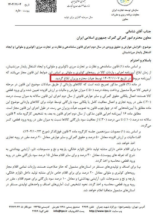 افزایش عوارض و حقوق ورودی در تجارت مرزی کولبری و ملوانی از سوی سازمان توسعه تجارت به گمرک ایران ابلاغ شد.
