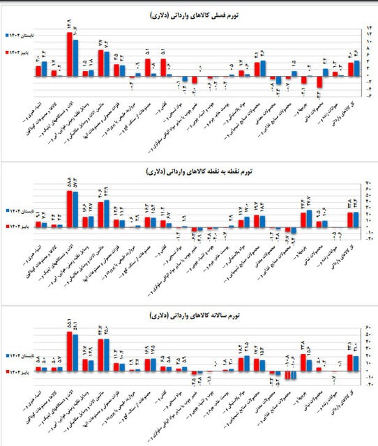 طبق آمار در پاییز ۱۴۰۴، تورم نقطه‌به‌نقطه شاخص ریالی واردات به ۱۶۷.۸ درصد رسید. بیشترین رشد با ۱۹۱.۴ درصد مربوط به گروه «ماشین‌آلات و وسایل مکانیکی و…» بود و کم‌ترین میزان افزایش نیز با ۱۲.۱ درصد به گروه «مروارید طبیعی و…» اختصاص داشت. در شاخص دلاری، تورم نقطه‌به‌نقطه واردات ۲۳.۸ درصد گزارش شد.