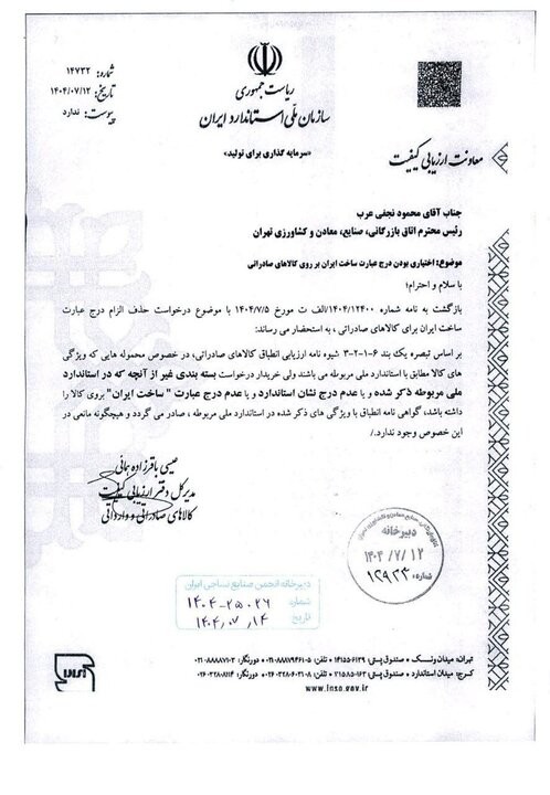 سازمان استاندارد در بخش نامه ای اعلام کرد در صورت رعایت استاندارد ملی، حذف نشان استاندارد یا عبارت «ساخت ایران» بنا به درخواست خریدار، مانعی برای صدور گواهی انطباق کالاهای صادراتی نیست.