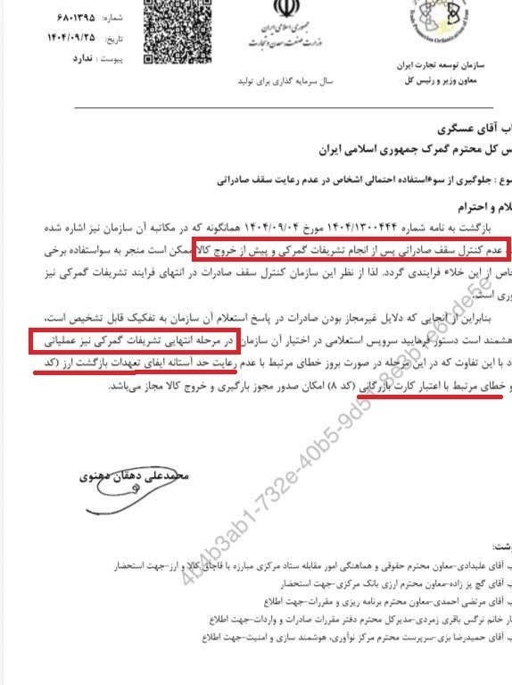 اخیرا رئیس سازمان توسعه تجارت ایران طی نامهای به رئیس گمرک اعلام کرده که بهدلیل عدم کنترل موثر سقف صادرات در فرآیندهای گمرکی، زمینه بروز برخی تخلفات صادراتی فراهم شده و از این سازمان درخواست کرده است تا کنترل سقف مجاز صادرات باید در مرحله نهایی تشریفات گمرکی بهصورت جدی اجرا تا از سوءاستفادههای احتمالی جلوگیری شود.